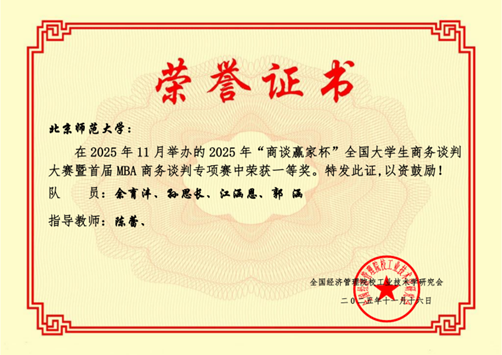 2025年11月9日,由全国经济管理院校工业技术学研究会沟通与谈判委员会主办的2025年“商谈赢家杯”全国老员工商务谈判大赛圆满落幕。在此次大赛的网络赛本科组角逐中,由威廉希尔足球官网本科生江涵恩、郭涵,与校内其他优秀学子余育沣、孙思长共同组成的“我说的都队”表现优异,荣获本科组一等奖。团队成员江涵恩、孙思长凭借出色的个人表现荣获“优秀谈判手”称号,指导教师陈蕾教授荣获“优秀指导老师”奖。