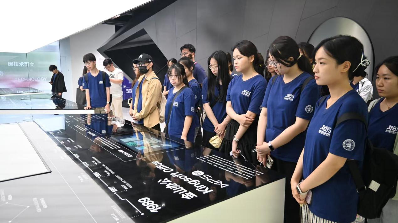 随后,师生们跟随工作人员的脚步,深入探访金山软件园的各个标志性区域。从承载着企业历史记忆的大堂,到展示前沿创新成果的展厅,再到洋溢着人文关怀的员工生活区域,每一处都蕴含着金山独特的文化底蕴与发展脉络。尤其在“明日之城”场景展览中,以高新科技、未来畅想、AI文化等为主题的丰富展品与交互式设施,让师生们沉浸式领略了金山一路走来的发展历程、独具魅力的企业文化,以及面向未来的宏伟愿景。