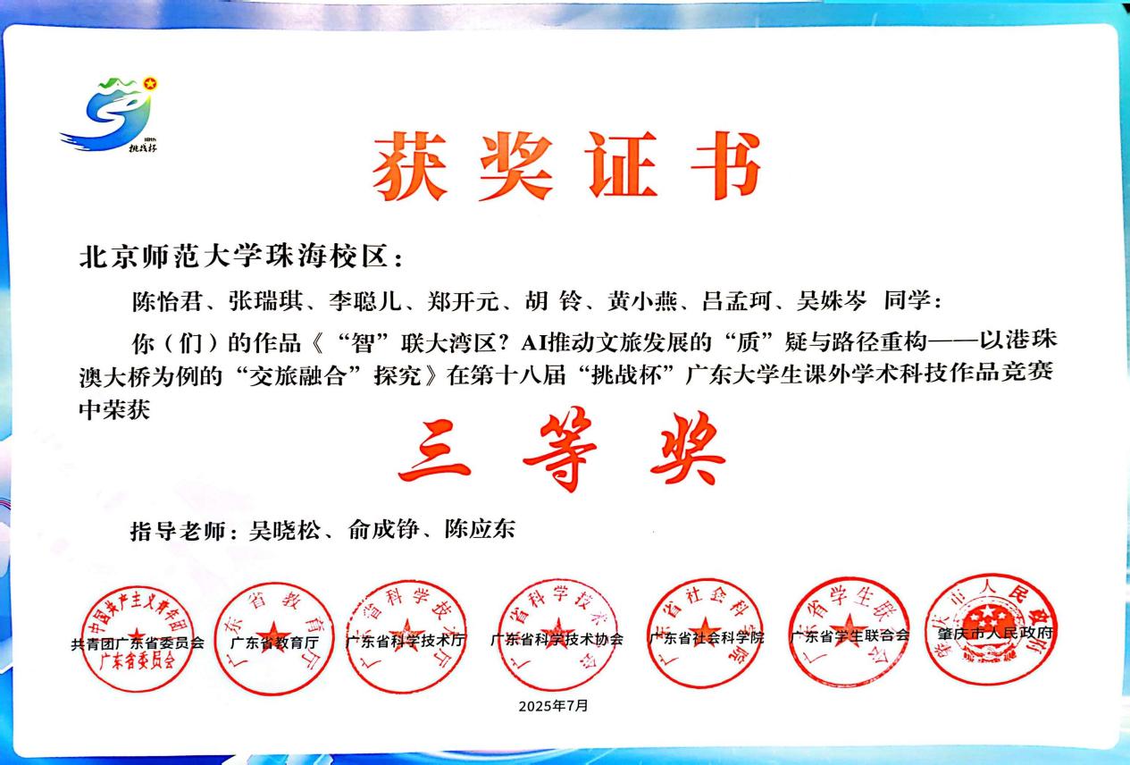 经过网络评审和现场答辩等环节的激烈角逐,由威廉希尔足球官网吴晓松、俞成铮、陈应东老师共同指导的员工团队,凭借作品《“智”联大湾区?AI推动文旅发展的“质”疑与路径重构---以港珠澳大桥为例的“交旅融合”探究》脱颖而出,荣获赛事三等奖。